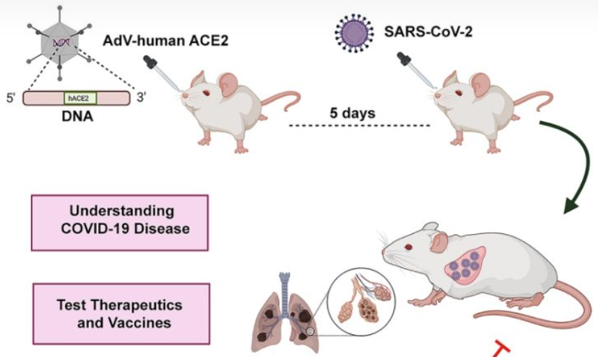 新型小鼠模型制备新冠小鼠模型除了转基因的方式之外,还有用腺病毒载体转导hACE2制备新冠模型小鼠的方法。2020年6月10日,广州呼吸疾病国家重点实验室赵金存教授团队联合多家单位共同发表了利用腺病毒载体制备的新冠小鼠模型,如下图所示,该研究通过复制缺陷型腺病毒(Ad5-hACE2)将外源hACE2通过鼻内转导的方式递送入C57BL/6和BALB/c两种品系及相应基因敲除的小鼠中,对小鼠进行攻毒实验,通过免疫印迹和流式细胞术检测hACE2的表达。