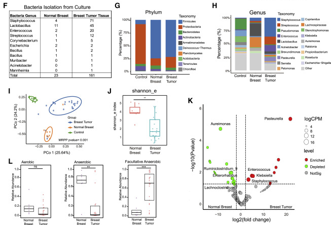 自发小鼠BT含有大量的活细菌研究人员通过16S测序全面描述组织驻留菌群的组成。对16S文库构建流程进行了优化,通过添加生物素富集步骤来减少非特异性基因组序列,比传统方法检测肠道菌群的灵敏度显著提高。据此,研究分析了正常组织和肿瘤组织中的微生物群(图1)。无监督聚类分析显示,对照(NTC和EBC)、正常乳腺组织和BT组织具有明显的微生物群落(图1I)。阴性对照样品中大部分微生物为变形菌门(Proteobacteria,图1G和S1I),而组织样品富集为厚壁菌门(Firmicutes,图1G)。研究数据共同表明PyMT自发性肿瘤中含有大量的活菌。